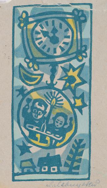 Greeting cards made using colour or monochrome linocut technique are particularly interesting among Leopold Levytskyi's graphic work of the 1960s and 1970s. These cards were intended to greet friends on New Year's Day and Christmas. The artist often humorously depicted himself and his wife, Yevheniia (Henia), in a stylised form, indoors or against a landscape. This postcard depicts a clock with a round pendulum against the backdrop of a starry sky over the village. On the pendulum's disc, the Levytskyi family is seated at a festive table with glasses of wine in their hands.