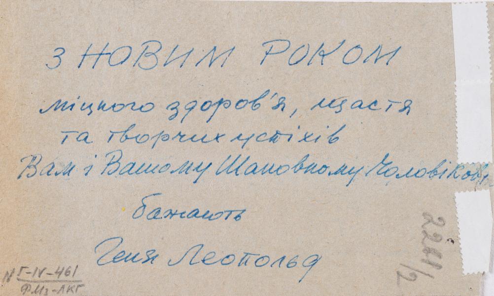 To the right, under the image, is the artist's signature. On the back, in the top right corner, are numbers in pencil: "2261/2". The greeting text is in blue ink: "Happy New Year / Wishing you and your dear husband good health, happiness, and creative success. Henia Leopold".
