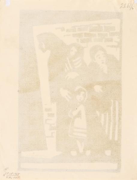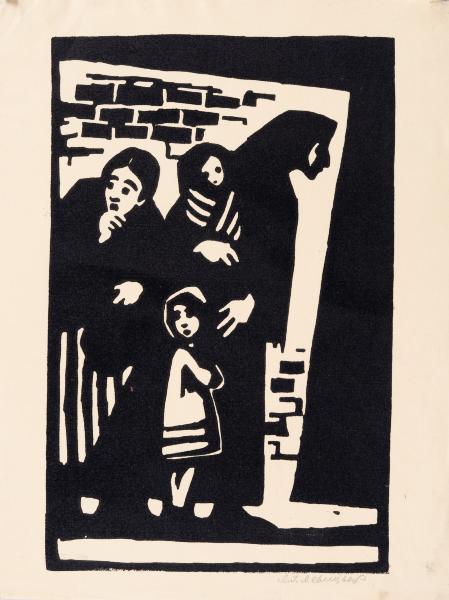 The print depicts two women standing against a brick wall, looking around in fear. One of the women holds a small swaddled child in her arms. The older girl stands next to her mother.
