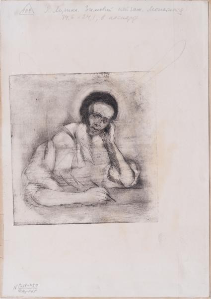 On a blue background is an image of black branches. On the reverse side, in the centre of the sheet, in a square frame, there is a sketchy frontal portrait of a black-haired woman sitting pensively at a table, writing something. The image is lightly crossed with a pencil.