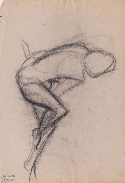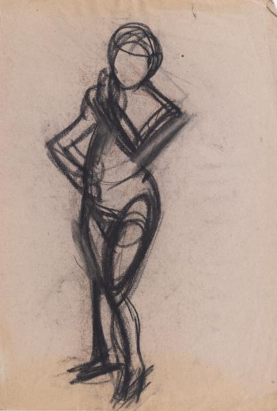 The work is a sketch of a nude female figure standing half-turned. On the reverse is a sketch of a nude female figure sitting on the floor with her back to the viewer.