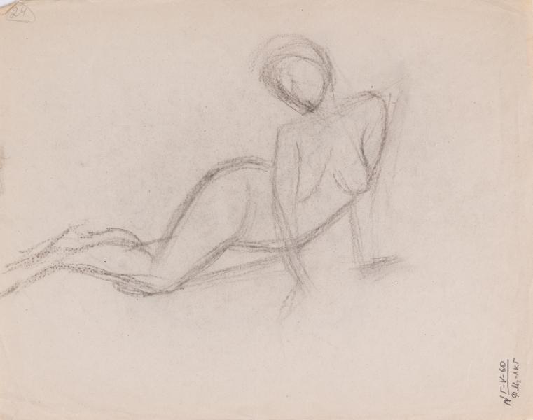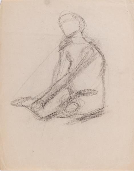The work is a sketch of a nude female figure sitting on the floor. On the reverse is a sketch of a reclining nude female figure.
