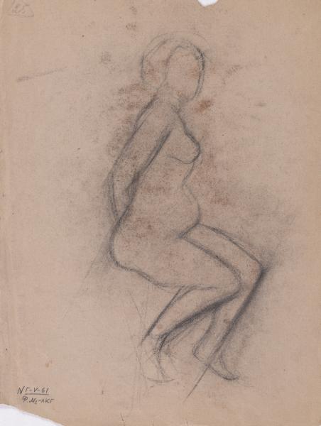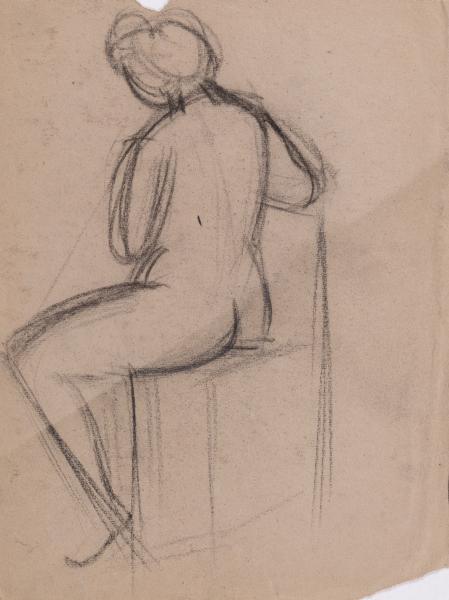 The work is a sketch of a nude female figure sitting on a chair with her back to the viewer. On the reverse is a sketch of a nude female figure sitting half-turned.