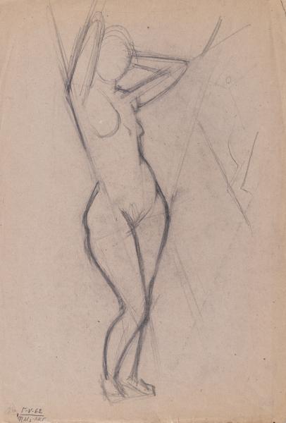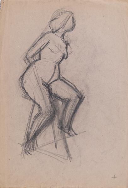 The work is a sketch of a nude female figure sitting on a high chair. On the reverse is a sketch of a nude female figure standing.