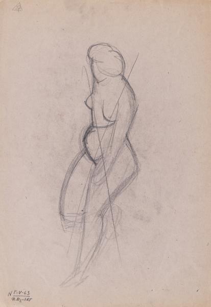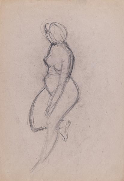 The work is a sketch of a nude female figure standing, leaning on one leg. On the reverse is a sketch of a nude female figure standing, leaning on one leg, which is crossed out in pencil.
