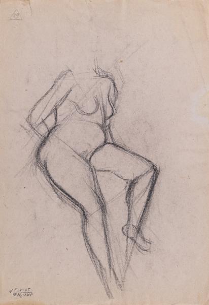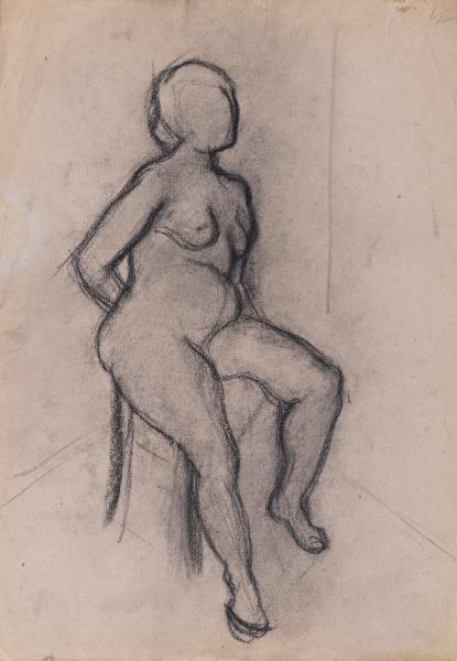 The work is a sketch of a nude female figure sitting on a chair. On the reverse is a sketch of a nude female figure sitting. The head is not sufficiently traced.