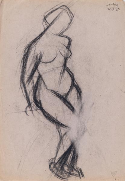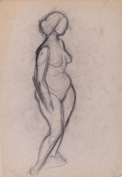 The work is a sketch of a nude female figure standing half-turned. On the back is a reversed image: a sketch of a nude female figure leaning on a figurative object with her hands.