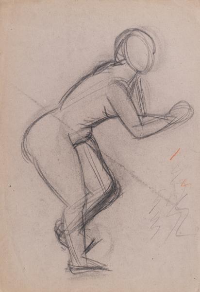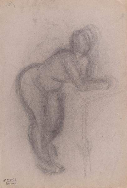The work is a sketch of a nude female figure leaning forward and resting her hands on a figurative object. On the reverse is a sketch of a nude female figure leaning forward and resting her hands on a figurative object.