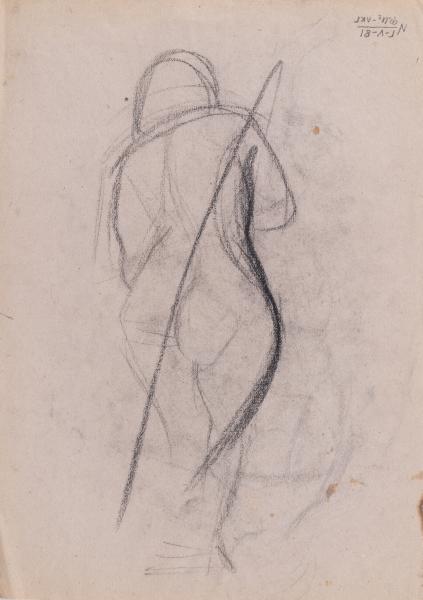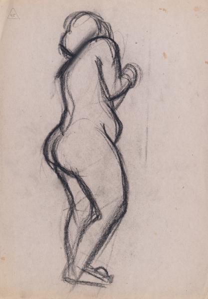 The work is a sketch of a nude female figure standing with her back to the viewer. On the reverse is a sketch of a nude female figure standing with her back to the viewer, crossed out in pencil.