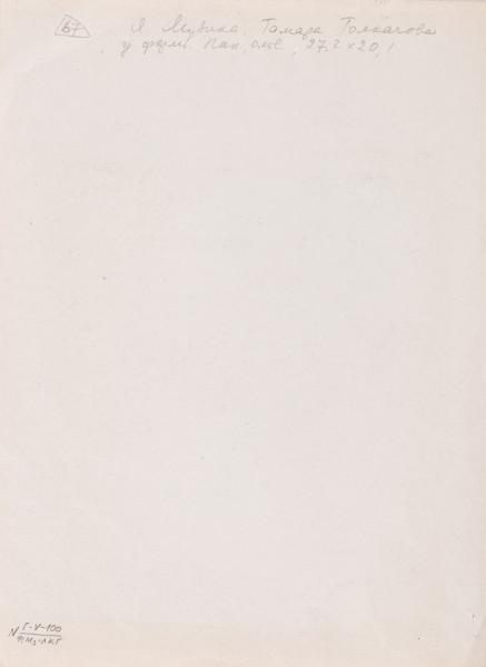 Under the image is a pencil inscription by the author: "Tamara Tolkacheva in a uniform". On the reverse side, at the top left, there is a pencil inscription in a triangle with the number "67". Next is an inscription in pencil: “Y. Muzyka. Tamara Tolkacheva in a uniform; paper, pencil, 27.2 x 20.1".