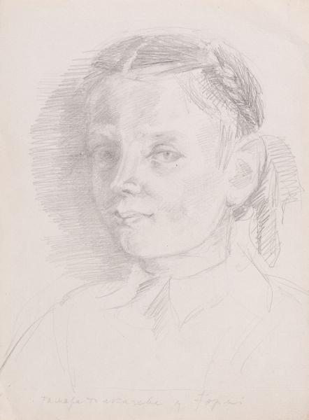 The work is a sketch bust portrait of a young woman in a slightly half-turned pose. A turn-down collar is outlined at the neck. Her hair is braided and tied with a ribbon at the back of her head.