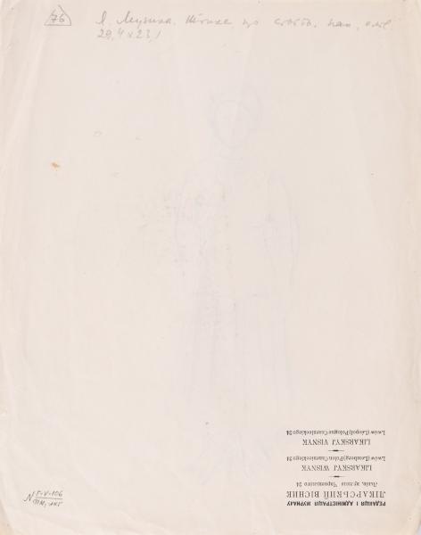 The sheet is on the letterhead of the editorial office of the magazine "Likarskyi Visnyk" ("Doctors' Bulletin") (24 Charnetskoho Street, Lviv), as evidenced by the printed text in the lower right-hand corner on the back of the drawing. There is also a pencil inscription inside a triangle in the upper left corner with the number "76". Next is a pencil inscription: "Y. Muzyka. 'A woman standing'; paper, pencil, 29.4 x 23.1 cm".