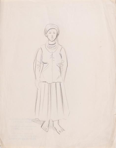 The work is a full-length sketch of a woman standing barefoot in traditional Ukrainian costume.