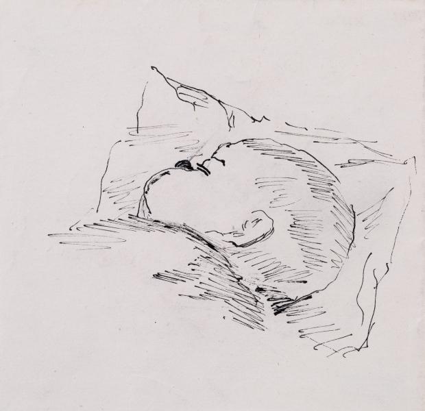 Sketch of a small child's head with its right cheek resting on a pillow.