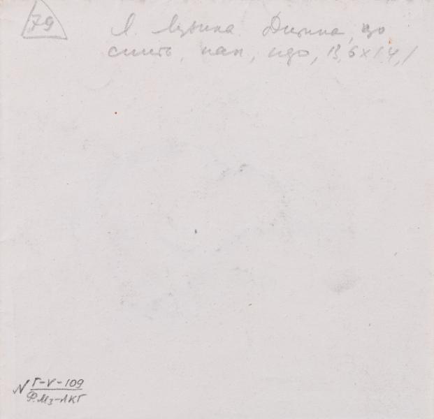 On the back, at the top left, the number "79" is written in pencil within a triangle. Next is an inscription in pencil: "Y. Muzyka. Sleeping child; paper, fountain pen, 13.6 x 14.1".