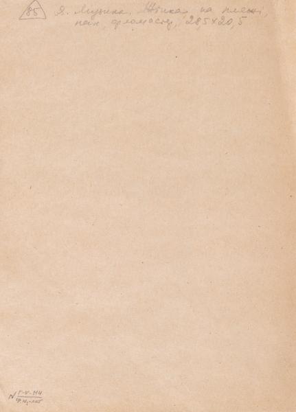 On the reverse, the number "85" is written in pencil in a triangle at the top left. Next is an inscription in pencil: "Y. Muzyka. Woman on the beach; paper, felt-tip pen, 28.5 x 20.5".
