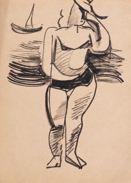 The work is a full-length sketch of a woman in a swimsuit and hat, set against a stylised seascape with a sailing boat.