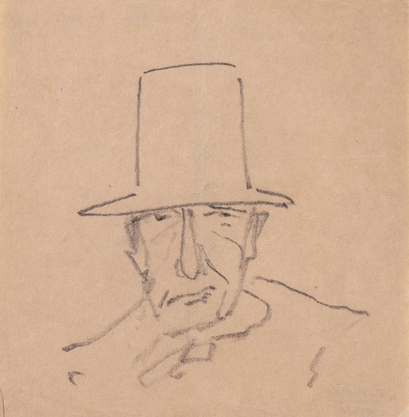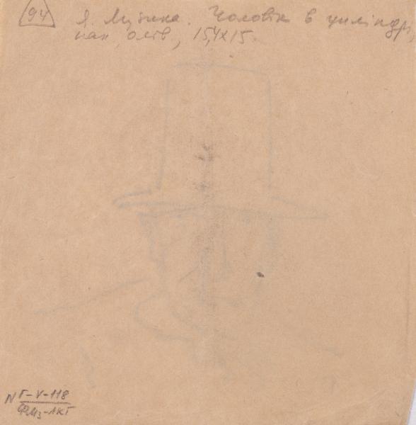 On the reverse, the number "94" is written in pencil in a triangle at the top left. Next is an inscription in pencil: "Y. Muzyka. A man in a top hat; paper, pencil, 15.4 x 15".