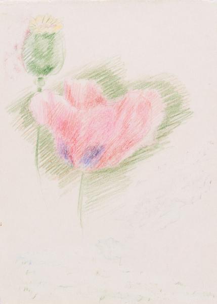 Yaroslava Muzyka created the "Siberian Flowers" series during her exile in Siberia from 1949 to 1955. In the centre of the sheet, a flower and a bud of red poppies are depicted against a light green background. On the reverse, at the bottom left, is a sketch of a child's head.