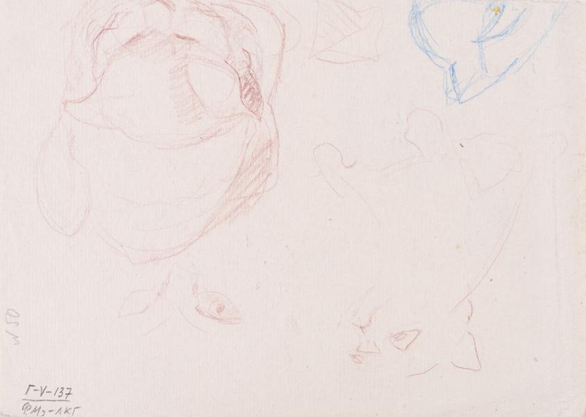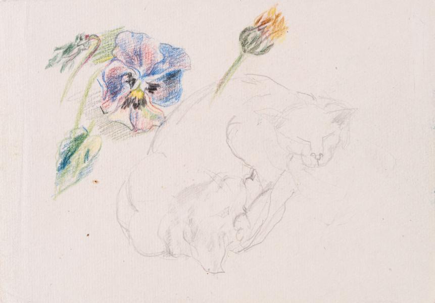 Yaroslava Muzyka created the "Siberian Flowers" series during her exile in Siberia from 1949 to 1955. In the centre of the sheet is a sketch of a sleeping cat. Above it, to the left, is a stem with a bud. To the left of the sketch is a wild violet flower. At the back of the sheet are sketches of cat heads and half-figures.