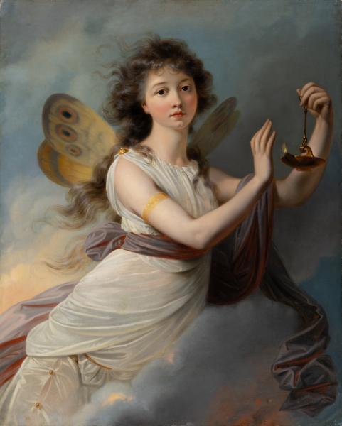 From the mid-eighteenth century to the end of the nineteenth century, mythological portraiture was a common form of representative, complementary portraiture. It allowed the most spectacular features of the model's appearance and moral qualities to be highlighted. The ancient myth of Psyche, who personifies the human soul in search of love, was prevalent in art. In paintings and sculptures, Psyche was depicted as a little girl or young woman, usually with butterfly wings, often together with Eros (Cupid). The allegorical representation of Zofia Czartoryska, née Zamoyska, as Psyche is not accidental, as her contemporaries described her as a talented woman of incomparable beauty. The countess was, for example, the author of an original manual entitled "Advice to a Daughter". In this painting by an unknown Austrian artist, Countess Zofia Zamoyska is depicted as a winged Psyche holding a torch among silver clouds. She carefully protects the lamp's flame from the wind, acting as the guardian of the hearth. She wears a white dress in the Greek style, girded with a long dark purple belt. The forearm of her right hand is adorned with a golden bracelet. Her gaze is melancholy, directed towards the viewer.