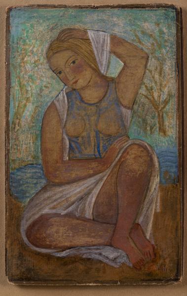 In the background of a summer landscape with a river and barely outlined tree trunks, a fair-haired girl is depicted sitting on a sandy shore. The girl is wrapped in a white sheet, one end of which she is likely using to dry her hair. She is wearing a transparent sleeveless blue blouse or a swimsuit. The girl's face has a bright blush, and her gaze is directed at the viewer. The painting was created under the influence of Byzantine art, characterised by a combination of flat silhouettes with smooth rhythmic lines and a pastel colour palette.