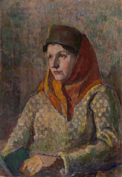 The painting belongs to the group of portraits painted in the Post-Impressionist style in the 1940s. It is a full-length portrait of a middle-aged woman sitting in an armchair, slightly tilted to the left, with an open book in her hands. The woman is wearing a grey-green hat with a red-orange shawl over it. The ends of the scarf fall over a green jumper with white dots. The sitter has turned away from the book and is looking thoughtfully into the distance. The background of the portrait is dark and neutral.
