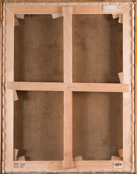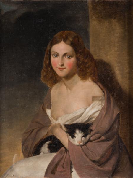 The work is an intimate knee-length portrait of a young woman sitting by a wall. A black-and-white cat is sleeping in her arms. The girl is wearing a white dress with a plunging neckline, over which she has draped a grey shawl that covers her shoulders and arms. Her charming face is framed by medium-length golden-brown hair, styled in a straight part with soft waves falling from the temples. The girl has a bright blush on her cheeks. With a faint smile, she looks at the viewer. The light coming from the left emphasises the girl's fair skin and creates a shadow behind her.