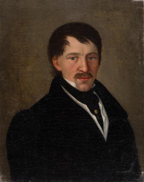 Against a greenish-ochre background is a half-length portrait of a middle-aged man with a moustache, slightly turned to the right. The portrayed man's short dark hair is combed over his forehead. He is dressed in a black tailcoat, a white shirt with a stand-up collar, and a black scarf fastened with a decorative pin. The gaze of his expressive grey eyes is directed at the viewer.