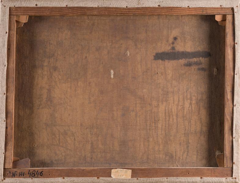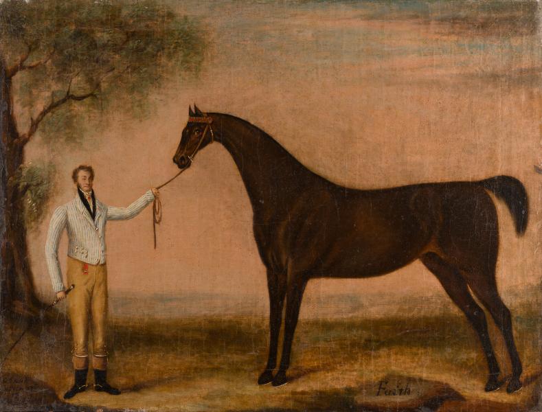 The work is a rectangular composition with a low horizon line; the right part features a full-length depiction of a black horse without a saddle. The young blond man in riding attire, consisting of a short white jacket, ochre breeches, and black boots, is holding the horse by the bridle. In his lowered right hand, the man is holding a riding crop. To the left of his back, a large green tree is depicted. In the lower-left corner is an illegible inscription; to the right, near the horse's hind legs, the word "Faith" is written in black paint on a rock. The work by an unknown artist is executed in the Biedermeier style, as evidenced by careful drawing, attention to small details, simplified modelling of the human figure, and the overall romantic and sentimental character of the composition.