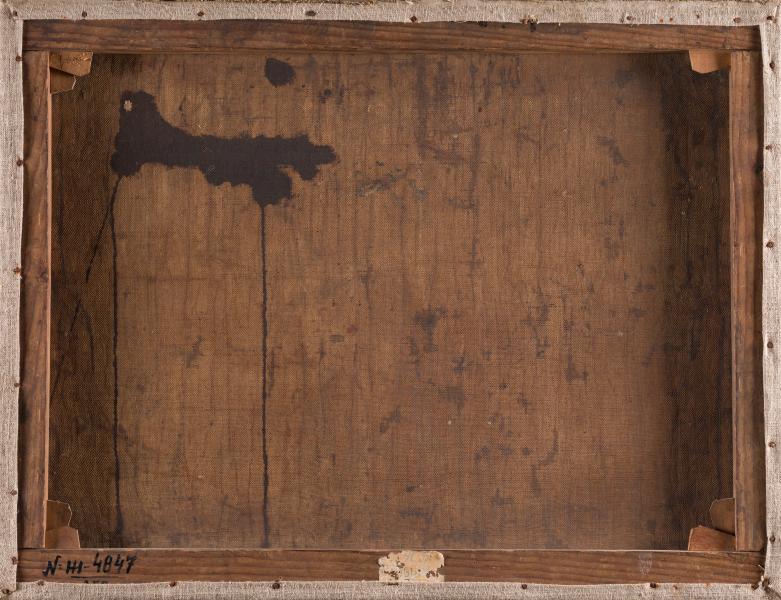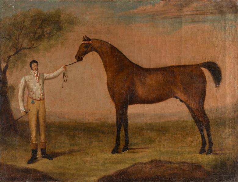 The work is a rectangular composition with a low horizon line; the right part is occupied by a full-figure image of a bay horse without a saddle. The horse is being held by the bridle by a dark-haired young man dressed in riding attire – a short white jacket, ochre breeches, and black boots. In his lowered right hand, the man is holding a whip. To the left, behind his back, a sprawling green tree is depicted. The work by an unknown artist is executed in the Biedermeier style, as evidenced by careful drawing, attention to small details, simplified modelling of the human figure, and the overall romantic and sentimental character of the composition.