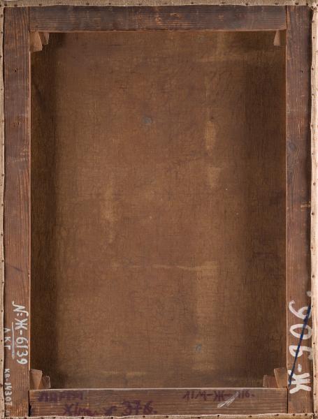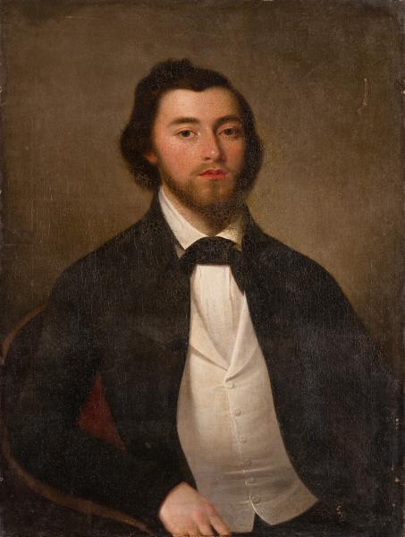 A waist-length portrait of a young man sitting in a chair slightly turned to the right. He is wearing a black frock coat, a white waistcoat, a shirt with a turned-down collar, and a black bow tie. The man has dark chestnut hair that is slightly wavy, along with a moustache and a small beard. With his right hand, he rests on the wooden armrest of the chair, which has a burgundy upholstery. The unknown artist masterfully conveyed the young aristocrat's self-importance, evident in his arrogant gaze directed at the viewer.
