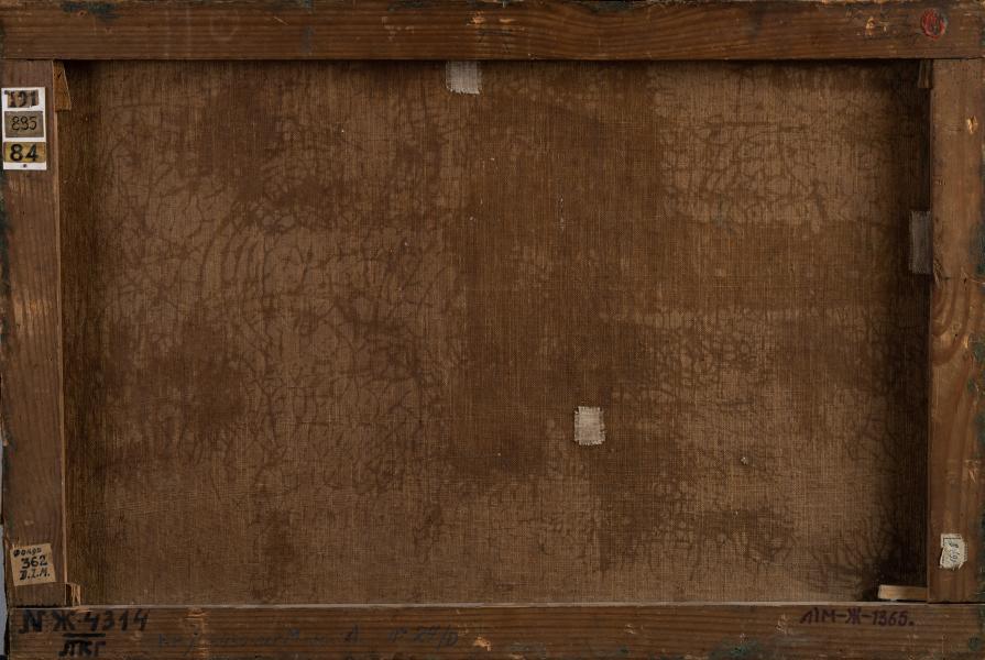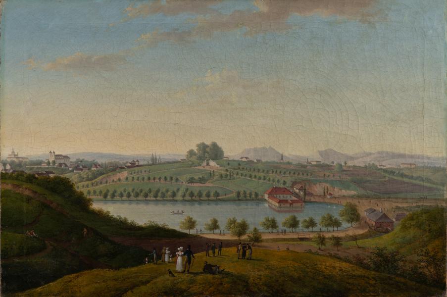 The painting is a typical example of veduta, popular in the 18th century – a multi-layered composition with a panoramic view of Lviv from the southern side. On the horizon, from left to right, the silhouettes of St. George's Cathedral, St. Mary Magdalene's Church, the rooftops of the Church and Monastery of St. Lazarus, and the outline of the Lviv High Castle are visible. In the panorama's centre is Pelczynski Pond, with the military swimming pool building, established in 1820 by General of Cavalry Count Jan-Karol Fresnel. The Wronowski Hill is depicted to the left, where the Citadel was later built between 1855 and 1857. In the foreground, detailed staffage figures of people strolling are depicted. Pelczynski Pond, which had been owned by the wealthy Lviv Pelk family since 1530, became one of the most popular spots for relaxation and leisurely walks among the city's residents in the 19th century. Since 1843, performances involving the military were regularly held here, the most famous of which was the "Battle with Sea Monsters" in 1845, which gained widespread attention in the contemporary press.