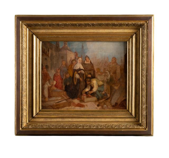 The sketch by Jan Matejko illustrates the medieval legend about Queen Jadwiga, who was renowned for her kindness and compassion. According to the legend, while passing by the construction of a church with her retinue, Jadwiga noticed that one of the stonemasons looked upset. She asked him the reason for his distress, and upon learning that he could not afford to call a doctor for his sick wife, she placed her foot on the stone, unfastened the golden buckle from her boot, and gave it to the astonished man. When the queen left, the workers noticed that her footprint was imprinted on the stone as if it were soft clay. They embedded it in the church's wall as a mark of gratitude. This very stone block with Queen Jadwiga's footprint is believed to be seen on the facade of the Basilica of the Visitation of the Blessed Virgin Mary in Krakow. In the sketch, against the backdrop of the church facade, a group of people is depicted standing amidst the construction. Surrounding them are scattered stone blocks. In the centre of the composition is a young woman in dark brown clothing with a white shawl covering her shoulders. She has placed her foot on the stone. One of the workers is kneeling before her and touching her boot with his hand.