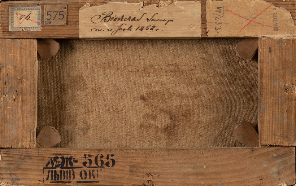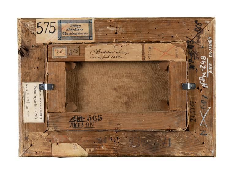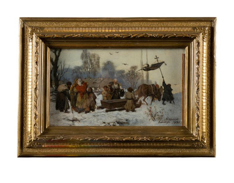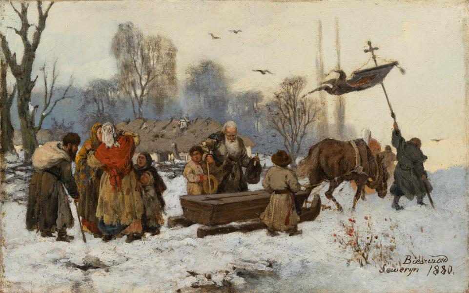 The "Rural Funeral" painting is paired with the work "To the Cross", depicting respectively the beginning and end of a person's life. This work depicts the final farewell of loved ones to the deceased. At the head of the funeral procession, a coffin cross is carried with a khorugv fluttering in the wind, as black as the silhouettes of crows in the sky. On the sled, which is being pulled with difficulty by a bay horse, rests a plain coffin. The older man with a long white beard, supported by a young lad, leaned over it. A few poorly dressed people are standing nearby. The tragedy of the scene is accentuated by nature itself. Twilight of the short winter day falls quickly; the leaden sky, grey snow, and black, bare tree branches seem to envelop everything around in sadness.