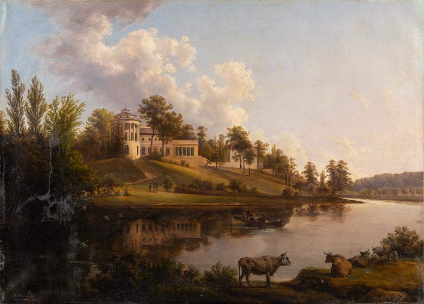 The landscape in the painting by Glowacki features all the elements of an ideal (imaginary) Romantic scene: a splendid view of a tranquil, wide river with grazing cattle on its banks; a palace on a high hill resembling an ancient temple, reflected in the water; staffage figures of people strolling through the park at dusk; a clear sky with light clouds and an atmosphere of calm and tranquillity. The painting accurately depicts a palace and park complex built over the Mleczka River in the early 19th century in the village of Zarzecze (Subcarpathian Voivodeship, Poland). This estate belonged to Countess Magdalena Morska (1762–1847) from the Dzieduszycki family, of the Sas coat of arms. The countess was an educated woman, artist, designer, and patron. Between 1817 and 1819, with the assistance of architect Chrystian Piotr Aigner, Magdalena Morska not only designed all the buildings, garden, and park of the palace complex in the Neoclassical style, inspired by the Temple of the Sibyl in Pulawy but also personally supervised their construction. To adorn her park, the countess annually imported new varieties of ornamental plants from Poland and abroad. After Magdalena's death, the estate was inherited by her nephew, Wladyslaw Dzieduszycki (1825–1899), the founder of the Natural History Museum in Lviv. Since 2008, a museum dedicated to the Dzieduszycki family has been established in the palace and park complex. Borys Voznytskyi Lviv National Art Gallery houses a portrait of Magdalena Morska-Dzieduszycka by Alojzy Reichan, as well as a portfolio of coloured lithographs featuring views of the palace and park complex, published by the countess in 1836. In addition to the illustrations, the album includes advice on construction and gardening.