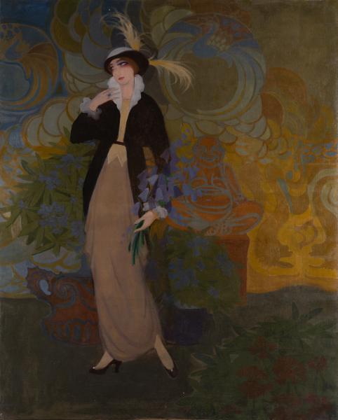 The Vienna Secession, particularly the work of Gustav Klimt, had a significant influence on Kajetan Stefanowicz – this explains his fascination with ornamental surfaces. A key artistic technique in the artist's works is the elastic, winding line, which creates rhythm and dynamism. The artist's attraction to Eastern motifs is evident in the use of vibrant oriental ornamentation, symbolism, and a focus on Eastern themes. This is precisely seen in the work "Parisian", where Eastern and Western cultures are contrasted yet harmoniously intertwined. The elegant figure of a tall young woman in a feathered hat resembles the stem of a flower. Her sleek attire, rendered in neutral black and light tones, contrasts with the vibrant ornamental background, which features a colour palette of blues, purples, greenish-yellows, and ochres. Amid the flowers and intricate dynamic lines, the outlines of dragons and peacocks can be recognised. In the background, behind the woman, is a statue of a smiling Budai on a pedestal, whose warm smile contrasts with the girl's melancholic expression. In Japanese mythology, Budai is the god of happiness, wealth, communication, joy, and prosperity. He is sometimes referred to as the Laughing Buddha.