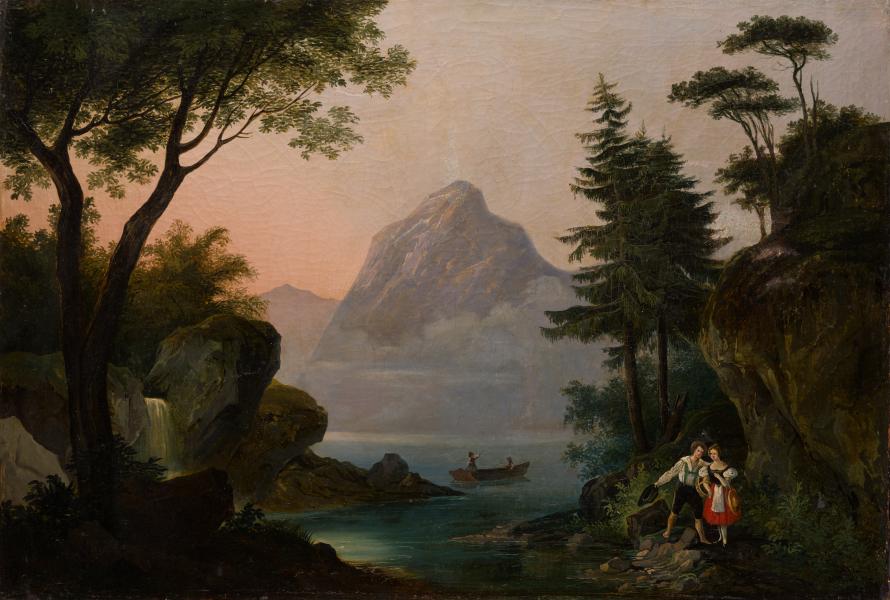 A Romantic mountain landscape featuring a river and waterfall, enlivened by a staffage scene with people. In the centre of the composition, against a clear sky bathed in the rays of the setting sun, is depicted a tall, barren mountain with a broad expanse of the river stretching out at its base. In the foreground, on either side of a small bay, are wooded cliffs with a waterfall. On the right, a young couple is depicted in traditional Austrian national dress on the rocky riverbank. In the distance, a small boat with fishermen is visible on the river.