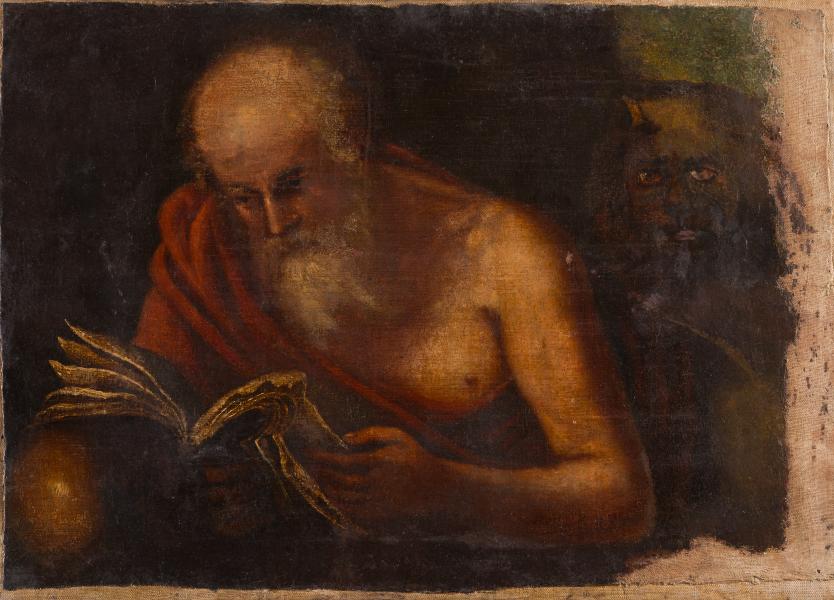 An iconographic bust-length depiction of the hermit Saint Jerome in a cave with his attributes: a book, a skull, and a lion. The saint is traditionally portrayed as an older man with a long grey beard, wearing a red cloak draped over one shoulder. He holds a book in his hands and reads with concentration. The light falling from the left illuminates his inspired face and shoulders. Below the book lies a skull, which, according to the artistic tradition of "vanitas", serves as a reminder of the transience of life. To the right of the saint sits the lion he saved – his faithful companion – who gazes almost with human eyes at the viewer from the darkness of the cave.