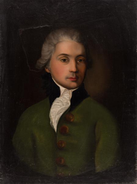 A waist-length portrait of a young man in a wig is framed within an oval. The head of the portrayed man is slightly turned to the right, with his gaze directed at the viewer. The man is wearing a green velvet camisole with large brown buttons and a black standing collar, beneath which a white jabot is visible.