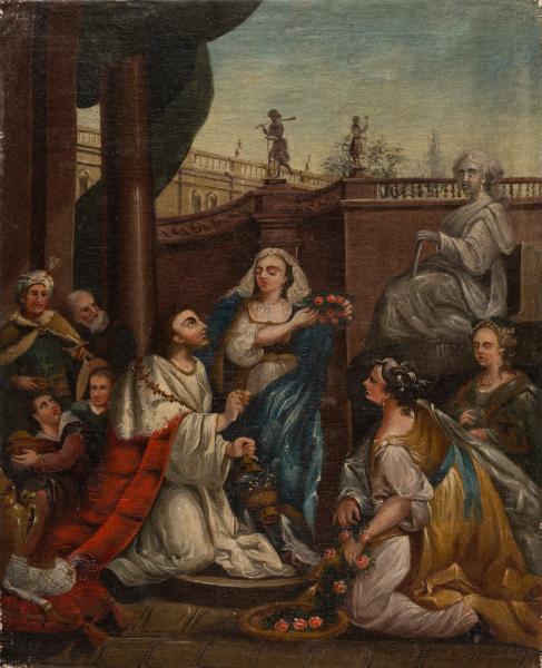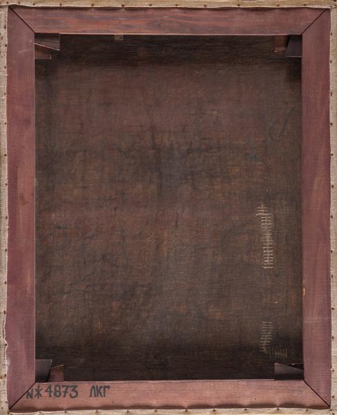 The work by the amateur artist is indirectly a simplified painted copy of a graphic piece by the Italian artist Jacopo Amigoni (engraver Francesco Bartolozzi, 1748–1754). From the eponymous etching by Jacopo Amigoni (1675/82–1752), his contemporaries and followers repeatedly created painted copies. The most notable among them are the following: the work by the Dutch painter Rienk Keijert (1709–1775), created in 1757; the work by an unknown master of the Tuscan School from the late 18th century; the painting by the Czech artist Vaclav Bernard Ambrosi (1723–1806), created in 1800. All these works are compositionally identical, except for minor differences in the details of the characters' clothing and surroundings. One of these painted versions (or another less well-known one) served as a model for the artist to copy. The Old Testament episode "The Idolatry of King Solomon" recounts how the wise King Solomon, swayed by the counsel of his pagan wives, turned away from the true God and began to worship idols, for which he was punished. In the centre of the multi-figure, enclosed composition, against the backdrop of a high wall with a fence, King Solomon is depicted in white garments and a long red mantle with a white fur collar. He is kneeling before a statue of the goddess Astarte, placed on an altar. In the mythology of Semitic peoples, Astarte is the goddess of fertility, motherhood, and love. She is equivalent to the Greek goddess Aphrodite and the Roman goddess Venus. On either side of Solomon stand three of his pagan wives, dressed in elaborate attire. One holds a wreath of roses, another weaves a garland, while the third silently watches. Four servants gathered behind the king under the colonnade, observing the king and the women with surprise and disapproval. In the lower-left corner of the painting, a red cushion is depicted, upon which a white turban and a gold crown rest. At the top of the composition, above the wall, is a blue-grey sky. The painting is distinguished by its vibrant, rich colours and the artist's attention to fine details.