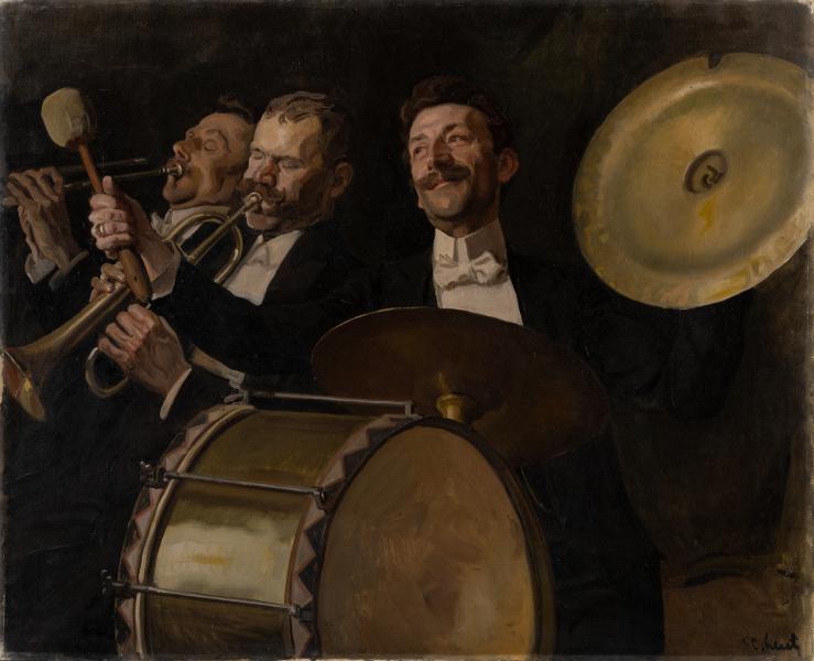 Portraits played a significant role in the artist's work, primarily representing individuals in genre scenes. The artist often depicted scenes from ordinary people's everyday lives, capturing their facial expressions in comical situations. Such depictions include the work "Fanfare", which portrays a group of three musicians passionately playing their instruments. The most prominent figure in this composition appears to be the drummer, who occupies a large portion of the scene and strikes the drum with a satisfied expression. The main characters of the painting, who play their fanfares with closed eyes (a type of small trumpet used for performing ceremonial compositions), are positioned in the background. The comical expressions on the musicians' faces and stances create the impression that each is playing their own melody, independent of the others. This lends a humorous character to the scene. The composition is concise and well-thought-out, with no unnecessary details and a clear rhythm. The colours are almost monochromatic. The artist uses shades of black and brown to model the figures and instruments, while the dark background emphasises the faces of the characters.