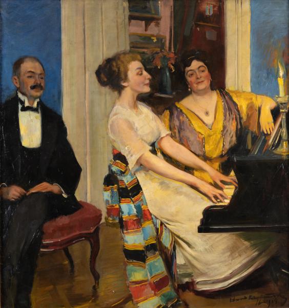 Konrad Krzyzanowski, born in Ukraine, is considered one of the most prominent figures of the Warsaw art circle. His most outstanding works were portraits. Working under the influence of modernism, the artist created portraits of a symbolic-expressive nature, employing a rich colour palette and exquisite technique. In his compositions, the piano or grand piano often resonates. While in the artist's early paintings, the musical instrument played a dominant role, in the 1914 canvas, it is a secondary object. Almost half of the composition is occupied by two women sitting at the piano. One of them – the one closer to the viewer – is in a white dress, playing the keys with inspiration. The other woman listens dreamily to the music. The man depicted to their left, dressed in a black tailcoat and sitting in a red armchair, listens intently to the chords. The colour-balanced and well-planned composition is executed with lively and bold brushstrokes.
