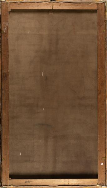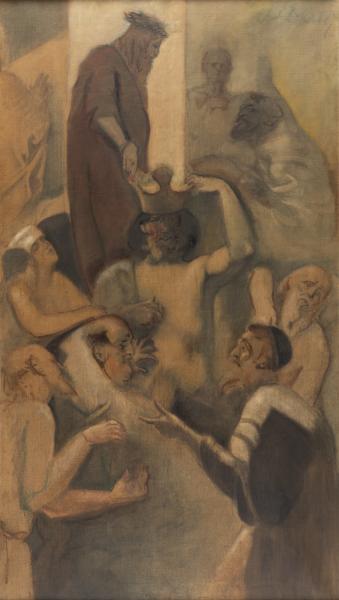 Known primarily for his fascination with Hutsul culture and the life of small Galician towns, Stanislaw Debicki was also interested in symbolism for a time. The vertical multi-figure composition "Capital" has an allegorical-symbolic character. At the centre, a semi-naked man with a face resembling a mascaron embodies Capital. Above him, dominating the scene is a profile depiction of Jesus Christ in a crimson cloak and a crown of thorns. He places a huge golden crown on the man's head with his hands bound, from which the Lord's wounds are bleeding. The sketched male and female figures surrounding Capital in various poses create an impression of dynamic movement. The composition is presented in a narrow range of warm shades of brown and black.