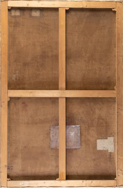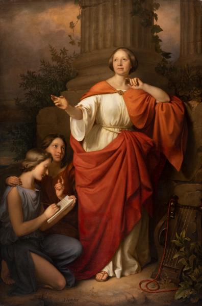 Jadwiga Luszczewska (1834–1908), known by her pen name Diotima, was an improviser, poet and writer of the Romantic era and the hostess of the most famous literary salon in Warsaw, which operated for about twenty-five years. She wrote poems, historical dramas, and reminiscences. The pseudonym Diotima ("honoured by God") was chosen for Jadwiga by her mother, Magdalena, as the name "Diotima" was trendy in the 18th and 19th centuries and often used in philosophical, artistic, and musical works. Diotima of Mantinea was a semi-legendary figure, an ancient Greek philosopher, priestess, and prophetess, and one of the central figures in Plato's dialogue "Symposium". In the painting by J. Simmler, Jadwiga Luszczewska is depicted in the guise of the legendary Greek figure Diotima, passionately improvising beside the walls of an ancient temple. She wears a long white chiton and a bright red cloak, fastened at the neck with a gold brooch. To her left, two girls carefully record her words. In the right corner, a lyre is visible, symbolising poetry.