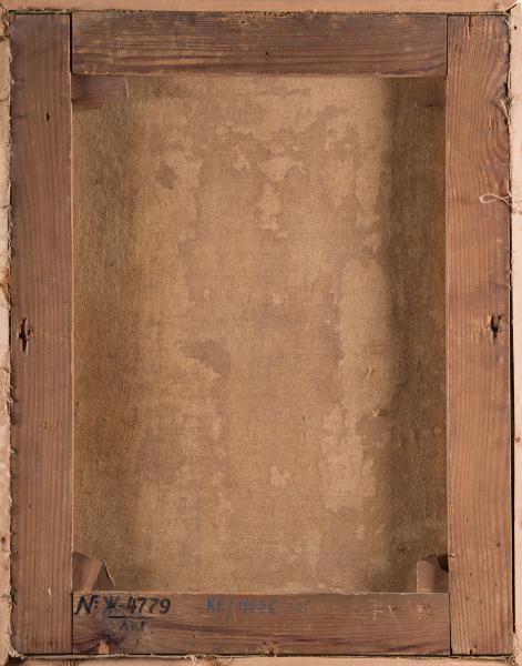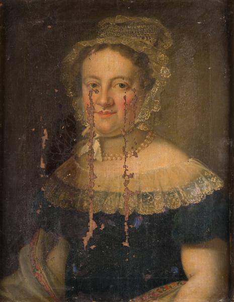 Almost the entire height of the vertical composition features a half-length portrait of a middle-aged woman, depicted in a slight turn to the left, with her gaze directed at the viewer, set against a neutral olive background. The portrayed woman is dressed in the Empire-style fashion of that time. She wears a dark blue velvet dress with puffed sleeves. The plunging neckline is adorned with white lace made of tulle. The outfit is complemented by a white velvet shawl decorated with a red and green patterned border. For jewellery, she wears two strands of pearls around her neck. A white lace cap tied under her chin with a bow is on the woman's head. Bouncy, light brown curls frame the high forehead. The full, round face has a simple and kindly expression. The woman gives a slight smile, which adds a more intimate quality to the portrait. The painting is likely a pair to the "Male Portrait" (Ж-4780). The form of the paired family portrait is characteristic of the Biedermeier painting style and is expected in the works by K. Schweikart.
