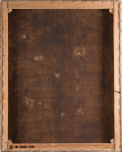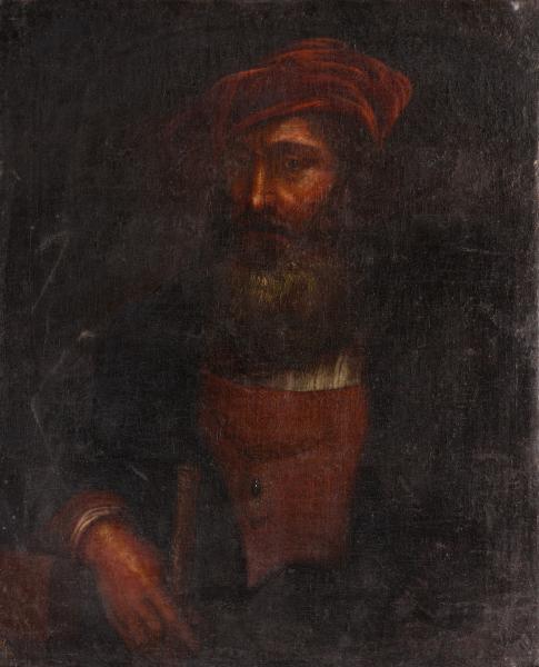 A painting by an unknown 19th-century artist from the Gallery collection is a freely simplified copy of the painting "Portrait of an Old Man with a Cane and a Hat" (formerly titled "Portrait of a Rabbi") by the Dutch painter Rembrandt van Rijn or a follower of Rembrandt (1645, Dresden Gallery), which is also known from engravings from the 18th century. While maintaining the overall compositional similarity to the 17th-century canvas, an unknown artist altered the painting's colour scheme to be more vibrant and warm. The work is a half-length frontal portrait of an older man with a grey beard and moustache, depicted against a neutral dark background. With his right hand, the man leans on a stone parapet and holds a cane. The second hand is not visible due to the darkening of the paint, but it can be assumed that, as in the 17th-century canvas, the subject holds a pair of gloves in his left hand. The noble posture and the elegant black and red attire emphasise the model's noble lineage and high social status. A heavy gold chain complements the outfit with a teardrop-shaped gemstone pendant. A striking accent is provided by the wide red velvet beret on the subject's head. The man's face is calm and serious. A silent sadness and contemplation are reflected in his dark eyes, whose gaze is directed towards the viewer.