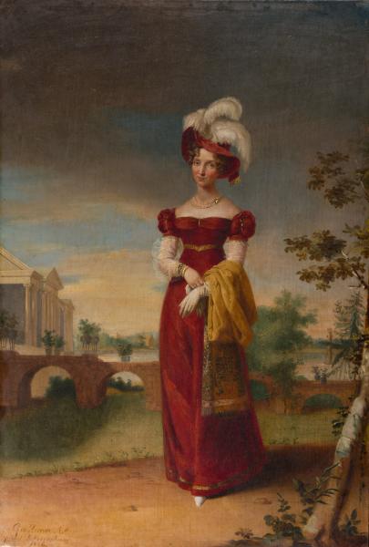 The work is one of the numerous portraits of Russian Empress Elizabeth Alexeievna (1779–1826), the wife of Emperor Alexander I, painted by British artist George Dawe. This full-length formal portrait exists in several authorised copies. The empress is depicted against the backdrop of the Tsarskoye Selo park, wearing a red Empire-style gown with a low neckline and transparent white sleeves. A yellow cashmere shawl, a red hat with white feathers, and white gloves complement the outfit. In the background is a building with columns in the classical style, a river, and an aqueduct.