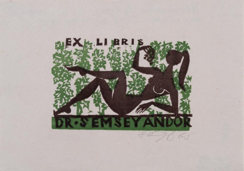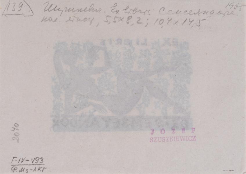 To the right below the image, there is the artist's signature in pencil and the date "65". On the back at the top, the number "139" is written in a triangle with a pencil. Below, there is an inscription: "Szuszkiewicz. Ex libris of Semseyandor, colour linocut, 1965, 5.5 х 8.2; 10.4 х 14.5". Lower right is a seal in purple paint: "Jozef Szuszkiewicz".