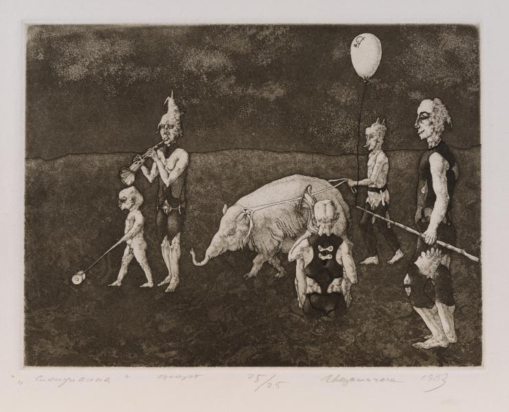 In their Gothic guise these sorts of grotesqueries represented human depravities given their apocalyptic form, that is to say their true form behind appearance, the revelation of otherwise hidden human sin as it will appear on the Judgement Day. Are Podolchak's visions in this fantastic space of repression likewise apocalyptic, though perhaps signalling a political dread of Orwellian nightmares becoming ecstatic?" (Edward Colless, "Essay". To the exhibition catalogue "Igor Podolchak. Ukrainian Printmaker", 1991).